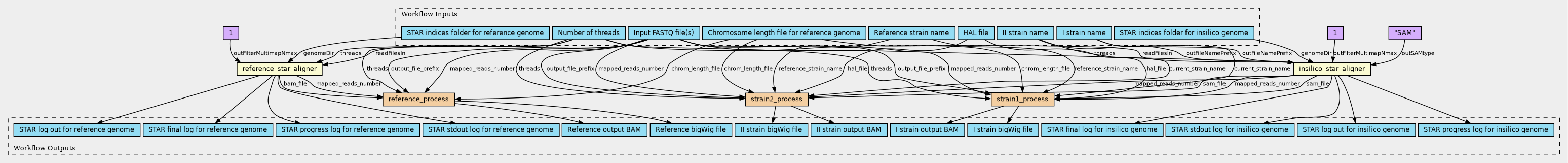 Workflow maps FASTQ files from `fastq_files` input into reference genome `reference_star_indices_folder` and insilico generated `insilico_star_indices_folder` genome (concatenated genome for both `strain1` and `strain2` strains). For both genomes STAR is run with `outFilterMultimapNmax` parameter set to 1 to discard all of the multimapped reads. For insilico genome SAM file is generated. Then it's splitted into two SAM files based on strain names and then sorted by coordinates into the BAM format. For reference genome output BAM file from STAR slignment is also coordinate sorted.