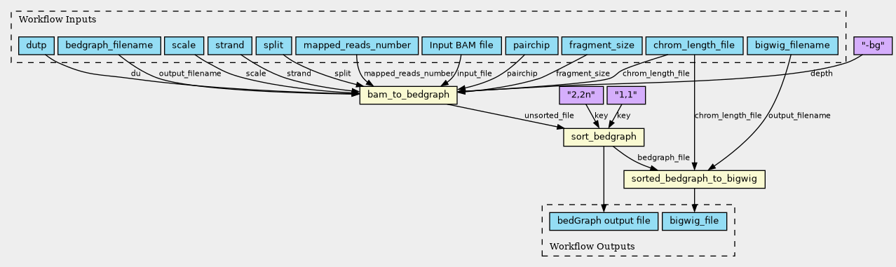 Workflow converts input BAM file into bigWig and bedGraph files. Input BAM file should be sorted by coordinates (required by `bam_to_bedgraph` step). If `split` input is not provided use true by default. Default logic is implemented in `valueFrom` field of `split` input inside `bam_to_bedgraph` step to avoid possible bug in cwltool with setting default values for workflow inputs. `scale` has higher priority over the `mapped_reads_number`. The last one is used to calculate `-scale` parameter for `bedtools genomecov` (step `bam_to_bedgraph`) only in a case when input `scale` is not provided. All logic is implemented inside `bedtools-genomecov.cwl`. `bigwig_filename` defines the output name only for generated bigWig file. `bedgraph_filename` defines the output name for generated bedGraph file and can influence on generated bigWig filename in case when `bigwig_filename` is not provided. All workflow inputs and outputs don't have `format` field to avoid format incompatibility errors when workflow is used as subworkflow.