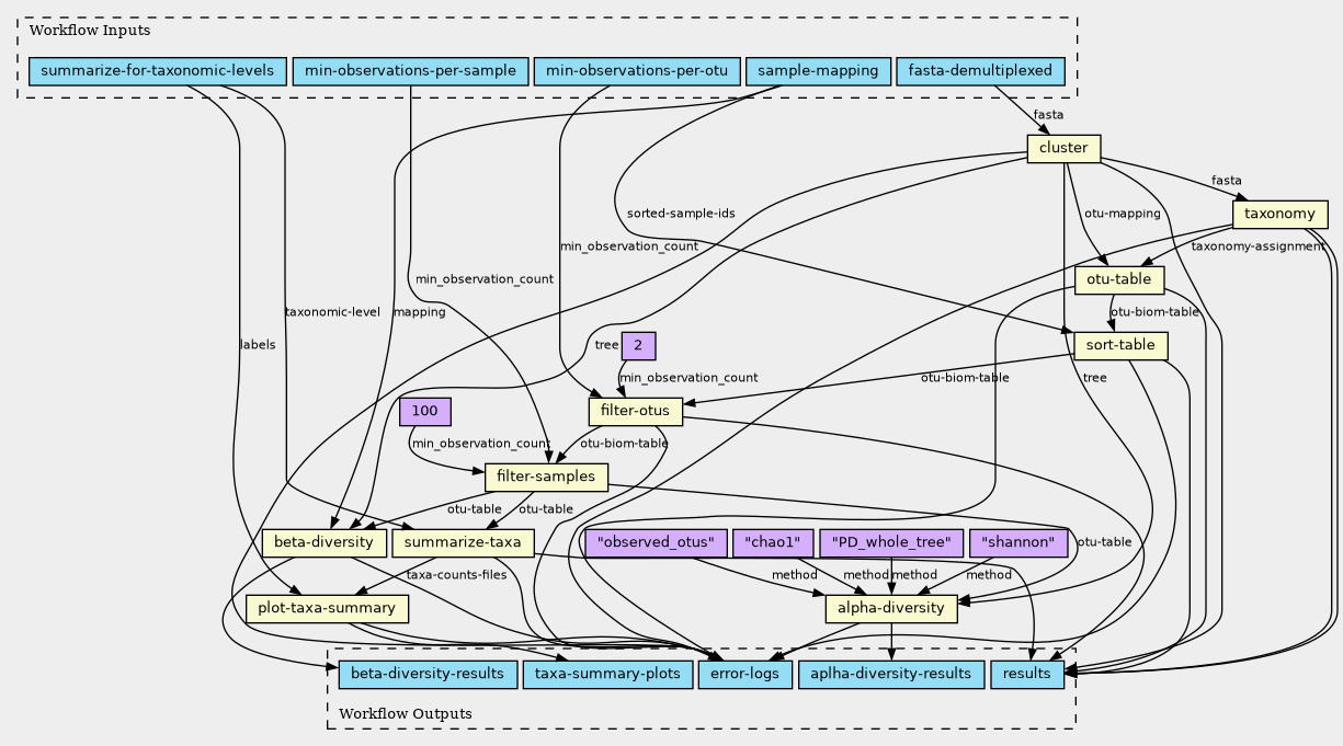 Input is a fasta file with n>1 samples, with sample id as sequence identifier prefix, and a sample id file. The workflow calls open reference otus and assigns taxa using greengenes. The output are taxa plots.
