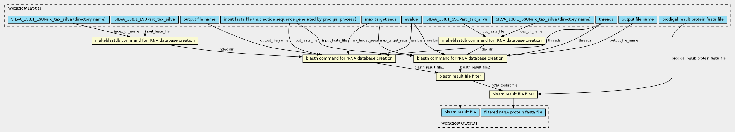 \"This workflow performs rRNA annotation processing for multiple index files using scatter. It executes 4 processes: makeblastdb, blastn alignment, filtering, and rRNA removal for each rRNA index file. related CWL file: ./Tools/09_makeblastdb_rRNA.cwl ./Tools/10_blastn_rRNA_alignment.cwl ./Tools/10_blastn_rRNA_filter1.cwl ./Tools/10_blastn_rRNA_filter2.cwl ./Tools/10_blastn_rRNA_filter3.cwl\"