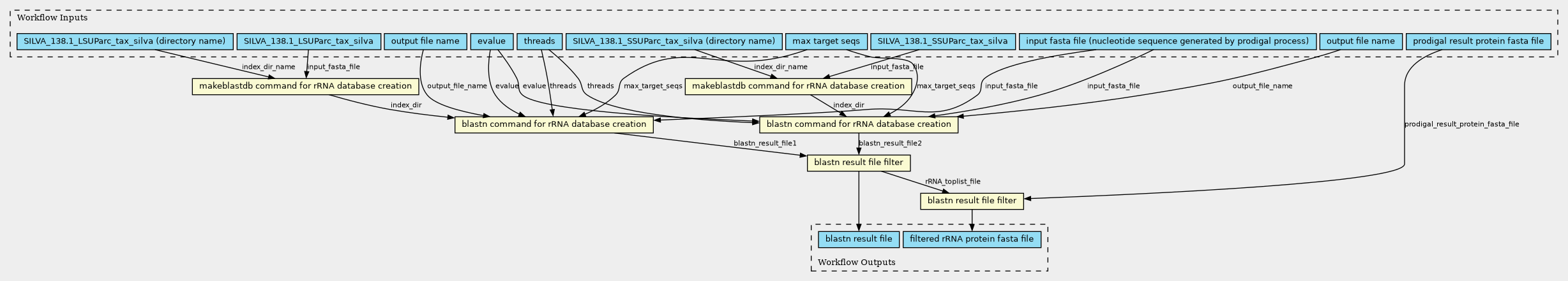 \"This workflow performs rRNA annotation processing for multiple index files using scatter. It executes 4 processes: makeblastdb, blastn alignment, filtering, and rRNA removal for each rRNA index file. related CWL file: ./Tools/09_makeblastdb_rRNA.cwl ./Tools/10_blastn_rRNA_alignment.cwl ./Tools/10_blastn_rRNA_filter1.cwl ./Tools/10_blastn_rRNA_filter2.cwl ./Tools/10_blastn_rRNA_filter3.cwl\"