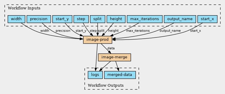 This workflow is composed of 2 Workflow steps: - image-prod: produce an image - image-merge: merge the images produced by several image-prod