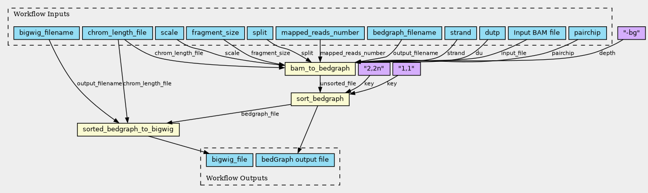 Workflow converts input BAM file into bigWig and bedGraph files. Input BAM file should be sorted by coordinates (required by `bam_to_bedgraph` step). If `split` input is not provided use true by default. Default logic is implemented in `valueFrom` field of `split` input inside `bam_to_bedgraph` step to avoid possible bug in cwltool with setting default values for workflow inputs. `scale` has higher priority over the `mapped_reads_number`. The last one is used to calculate `-scale` parameter for `bedtools genomecov` (step `bam_to_bedgraph`) only in a case when input `scale` is not provided. All logic is implemented inside `bedtools-genomecov.cwl`. `bigwig_filename` defines the output name only for generated bigWig file. `bedgraph_filename` defines the output name for generated bedGraph file and can influence on generated bigWig filename in case when `bigwig_filename` is not provided. All workflow inputs and outputs don't have `format` field to avoid format incompatibility errors when workflow is used as subworkflow.