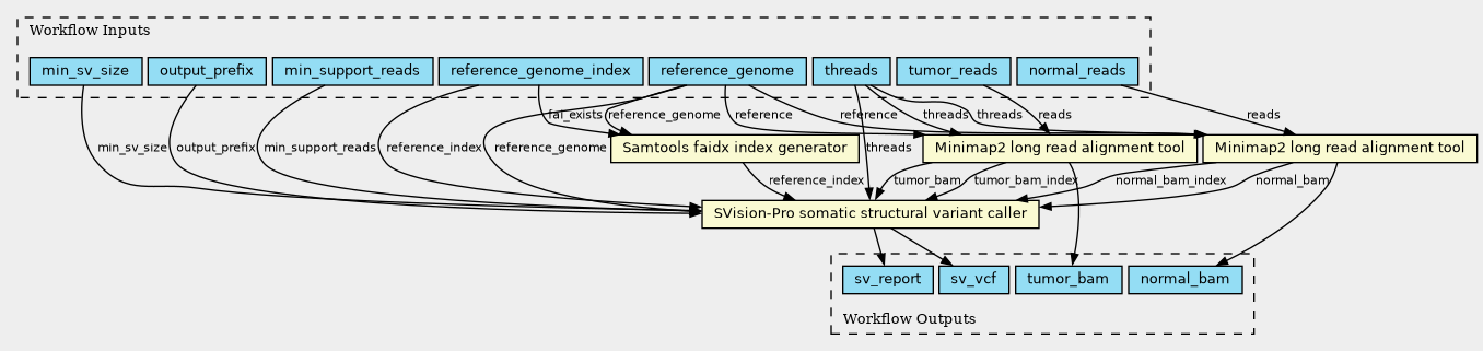 SVision-Pro is a structural variant (SV) caller designed for long-read sequencing data, with special optimization for Oxford Nanopore Technology reads. This tool definition is for somatic variant calling using tumor-normal paired samples. |