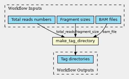Workflow runs homer-make-tag-directory.cwl tool using scatter for the following inputs - bam_file - fragment_size - total_reads `dotproduct` is used as a `scatterMethod`, so one element will be taken from each array to construct each job: 1) bam_file[0] fragment_size[0] total_reads[0] 2) bam_file[1] fragment_size[1] total_reads[1] ... N) bam_file[N] fragment_size[N] total_reads[N] `bam_file`, `fragment_size` and `total_reads` arrays should have the identical order.