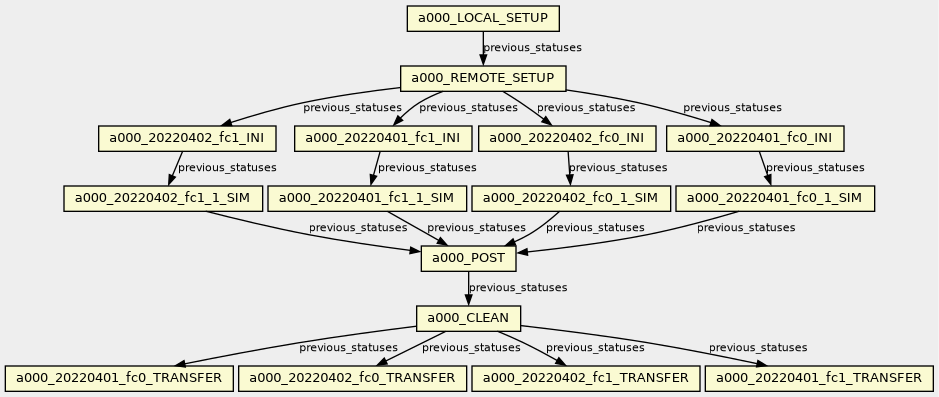 An example workflow created using Autosubmit's basic a000 workflow as reference. The `platform.yml` is ignored as it contains only information about platforms (e.g. it could be given to a tool like Troika as-is). `expdef.yml` and `autosubmit.yml` basically provide CWL inputs. `jobs.yml` contains the steps of the CWL workflow, with their dependencies. In CWL dependencies are specified via inputs and outputs. When task A outputs a value X, and task B has an input of type A/X, then the dependency A -> B is created in CWl. This is different than Autosubmit, and needs some care to guarantee the correct order in the workflow graph of start dates, members, chunks, etc.