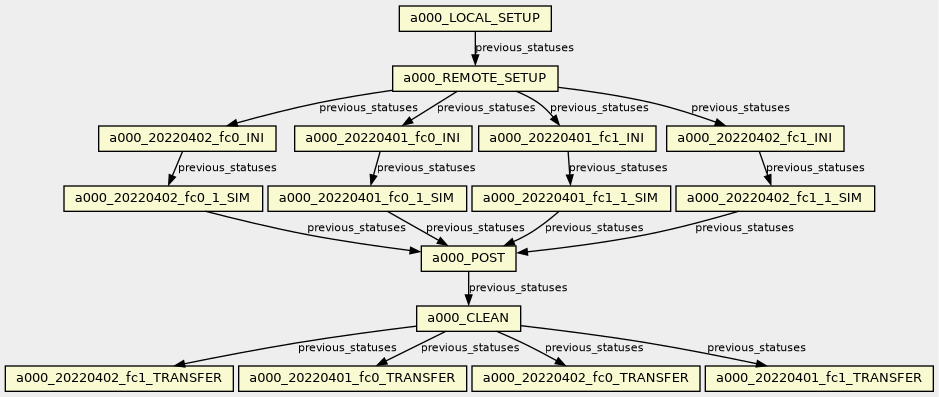 An example workflow created using Autosubmit's basic a000 workflow as reference. The `platform.yml` is ignored as it contains only information about platforms (e.g. it could be given to a tool like Troika as-is). `expdef.yml` and `autosubmit.yml` basically provide CWL inputs. `jobs.yml` contains the steps of the CWL workflow, with their dependencies. In CWL dependencies are specified via inputs and outputs. When task A outputs a value X, and task B has an input of type A/X, then the dependency A -> B is created in CWl. This is different than Autosubmit, and needs some care to guarantee the correct order in the workflow graph of start dates, members, chunks, etc.