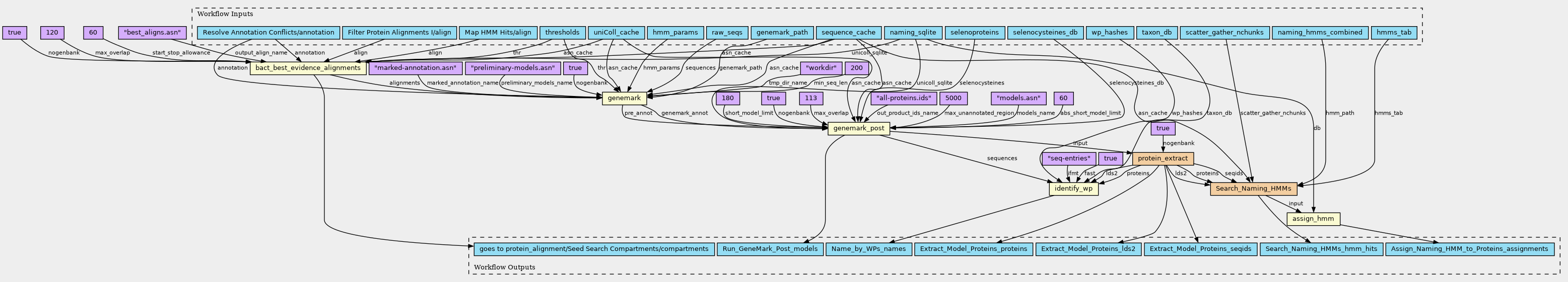 Workflow: Bacterial Annotation, pass 3, structural annotation, functional annotation: ab initio GeneMark, by WP, by HMM (second pass)