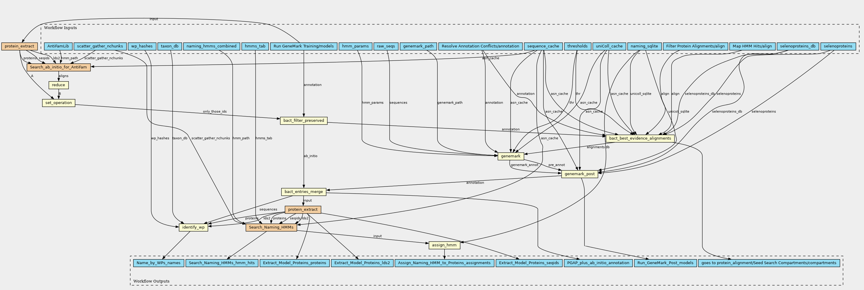 Workflow: Bacterial Annotation, pass 3, structural annotation, functional annotation: ab initio GeneMark, by WP, by HMM (second pass)