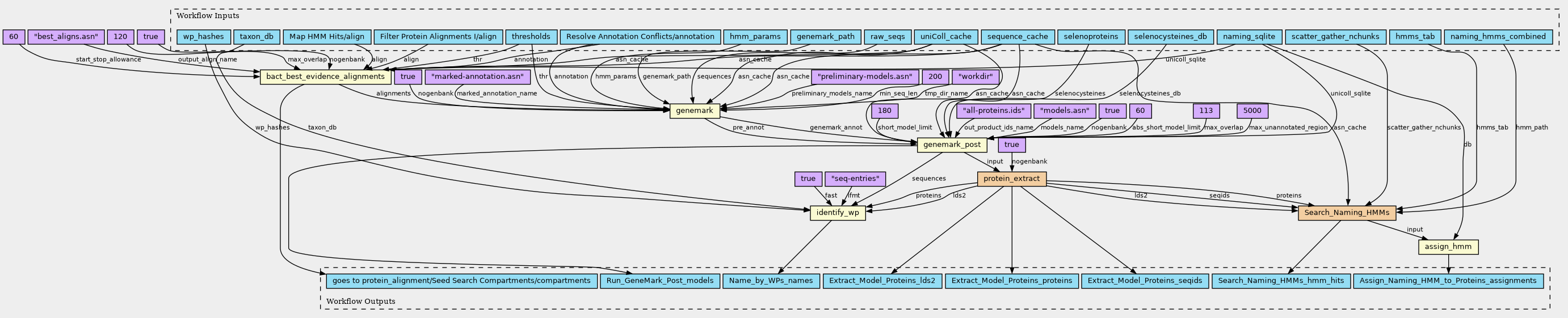 Workflow: Bacterial Annotation, pass 3, structural annotation, functional annotation: ab initio GeneMark, by WP, by HMM (second pass)