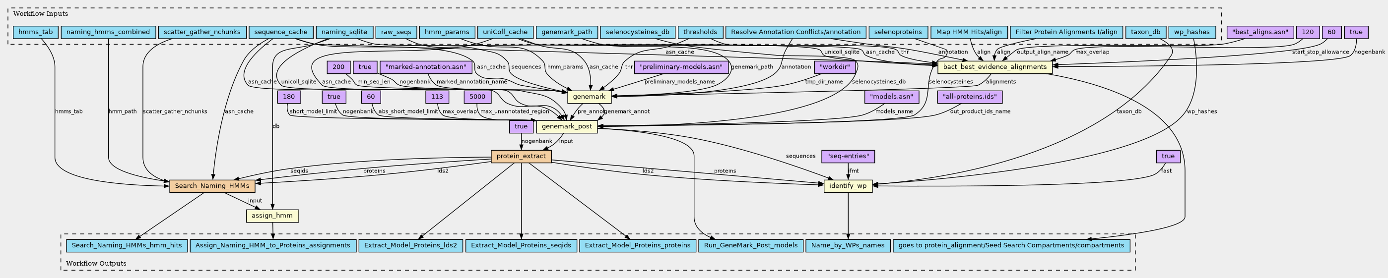 Workflow: Bacterial Annotation, pass 3, structural annotation, functional annotation: ab initio GeneMark, by WP, by HMM (second pass)