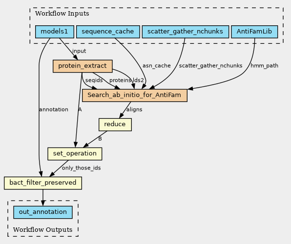 Workflow: Bacterial Annotation, ab initio (first pass) searched against AntiFam