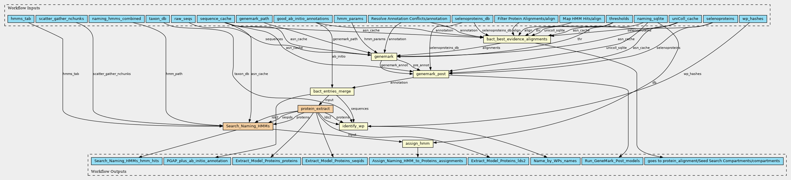 Workflow: Bacterial Annotation, structural annotation, functional annotation: ab initio GeneMark, by WP, by HMM (second pass)