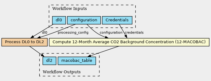 This tool implements UC-120-1.2. It downloads CO2 concentration data from the Scripps Institution of Oceanography (measured at Mauna Loa Observatory, Hawaii) and computes the 12-month average CO2 background concentration (12-MACOBAC). The `--config` input specifies the configuration file for the tool, and the optional `--log-level` input sets the logging verbosity. The output is used in atmospheric modeling workflows. |